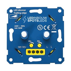 EU gekeurde fase afsnijding duo led dimmer met CE certificaat. De dimmer is uitgebreid getest en voldoet aan de eisen voor het dimmen van alle soorten dimbare ledverlichting, waaronder alle verlichting uit onze webshop! De dimmer dimt traploos (0-100%) zonder knipperen of vervelende bijgeluiden, met een bereik vanaf 0 tot en met 100 watt per kanaal.