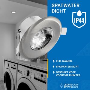 Verlicht diverse ruimtes met deze trendy, nikkel inbouwspot. Plaats hem bijvoorbeeld in het plafond in de woon- of badkamer, keuken, buiten onder een veranda of onder een overkapping. Deze led spot heeft een uniek design door het ontwerp van de glasplaat en zijn stralingshoek. Het licht wordt door de diffuser op een sfeervolle en warme manier door de ruimte verspreid. Door de ingebouwde driver is de inbouw led-spot direct aansluitbaar op 230 volt. Ook is hij IP44-spatwaterdicht, waardoor de spot geschikt is voor zowel vochtige ruimtes, zoals in de schuur, als droge ruimtes.