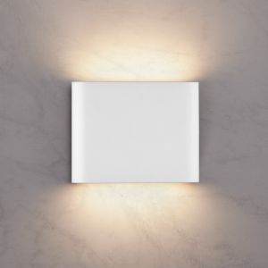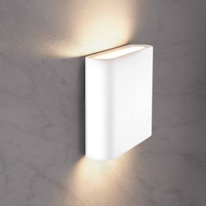 Deze witte aluminium dimbare led-wandlamp van 5 watt is direct aansluitbaar op 230 volt, bevat een up- en down light die extra warm wit licht uitstraalt en is IP65-straalwaterdicht.